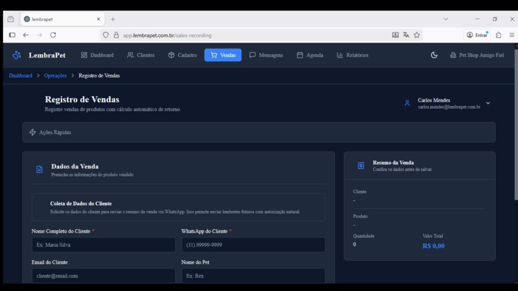 Na mesma tela, o sistema monta uma mensagem pronta:comprovante com resumo da venda + agradecimento + link do LembraPet. O atendente envia pelo WhatsApp para o cliente, e o processo começa.