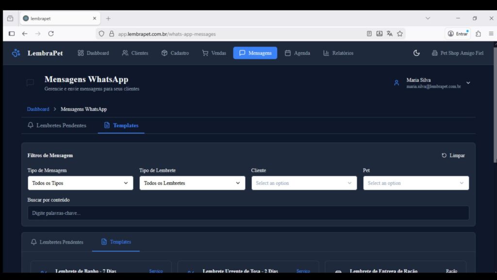 O envio pelo WhatsApp é feito com um click: na Aba Mensagem, no campo Templates você pode buscar pelos lembretes por Tipo de Mensagem, Tipo de Lembrete, Cliente e Pet, e enviar mensagens padrão ou mesmo editar mensagens para envio por Web ou Celular.
